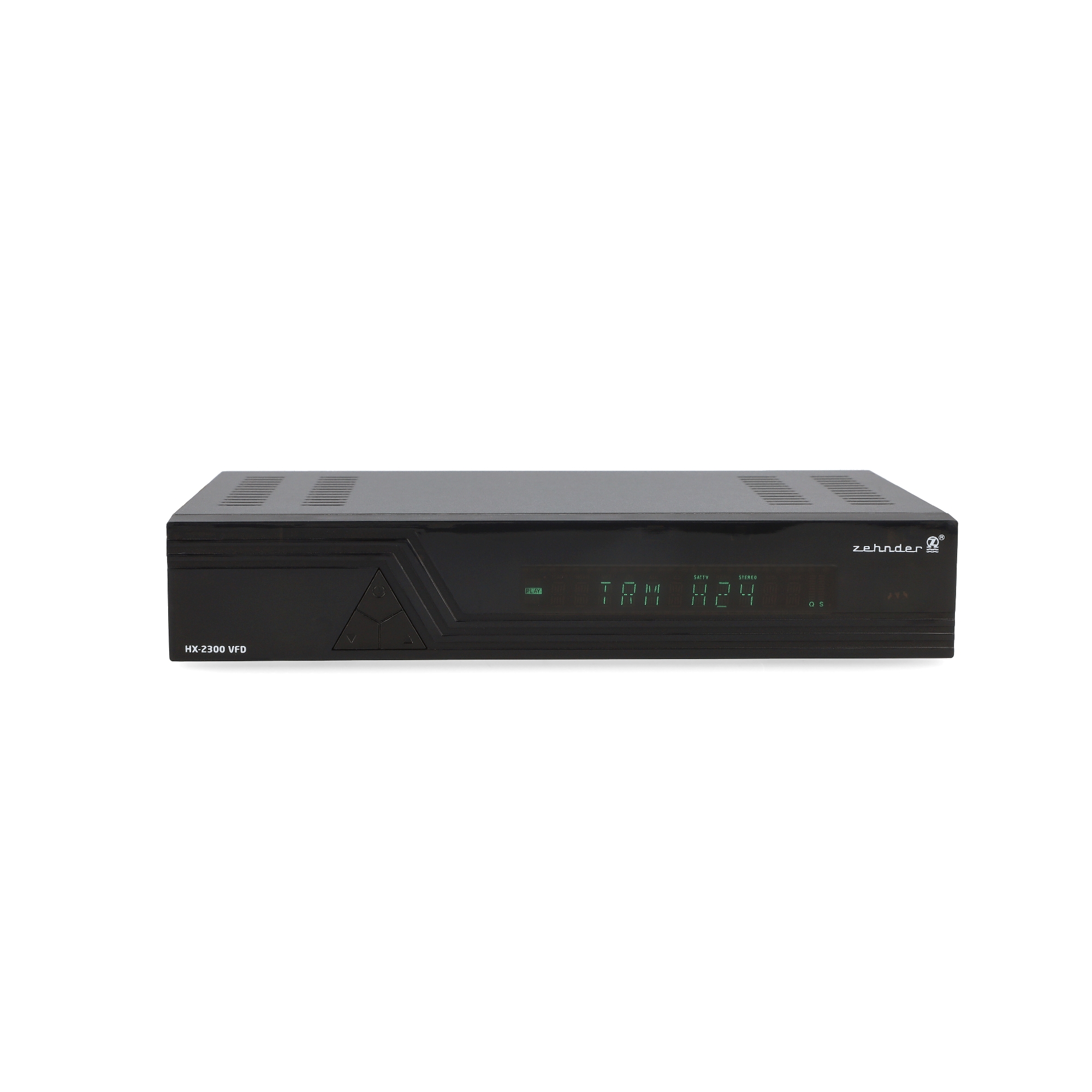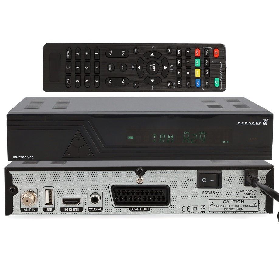 Dieser digitale Satellitenreceiver ZEHNDER HX-2300 VFD dient dem Empfang von digitalen und frei empfangbaren TV- und Radioprogrammen. Geeignet für den Einsatz sowohl in Einzelempfangsanlagen als auch Mehrteilnehmeranlagen in Sternoder Einkabelverteilungen neuester Technologie. Das integrierte alphanumerische VFD-Display bietet Ihnen einen übersichtlichen Komfort und zeigt Ihnen den Sendernamen im Display an. Es stehen Ihnen am Gerät unzählige Anschlüsse zur Verfügung: Ein USB 2.0 Port, ein digitaler Tonausgang (COAXIAL), ein Scart-Anschluss - sowie einen HDMI-Anschluss. Optional kann über den USB-Port eine WiFi Antenne angeschlossen werden. Zudem besitzt das Gerät einen mechanischen Netzschalter und ein fest installiertes Netzkabel. Durch den Anschluss einer externen Festplatte oder eines USB-Sticks wird das Gerät zu einer Multimediastation zur Wiedergabe von Filmen, Bildern und Musik oder zur Aufnahme Ihrer TV-Sendungen. Ein USB-Speichermedium (externe Festplatte oder USB-Stick) ist nicht im Lieferumfang enthalten. Zum Lieferumfang gehört eine lernbare Fernbedienung um Ihr TV-Gerät steuern zu können.