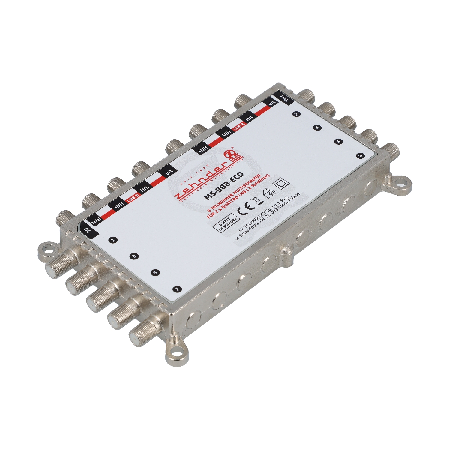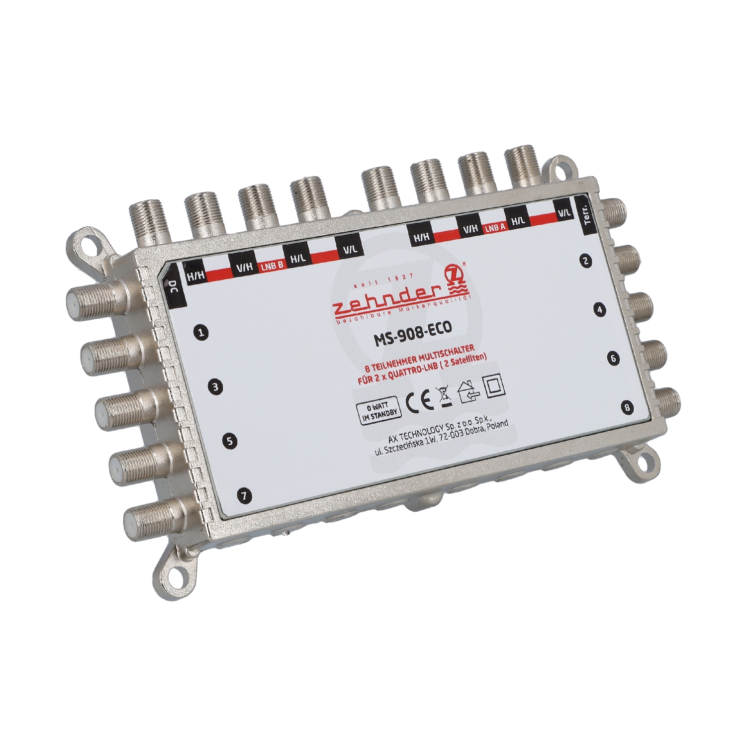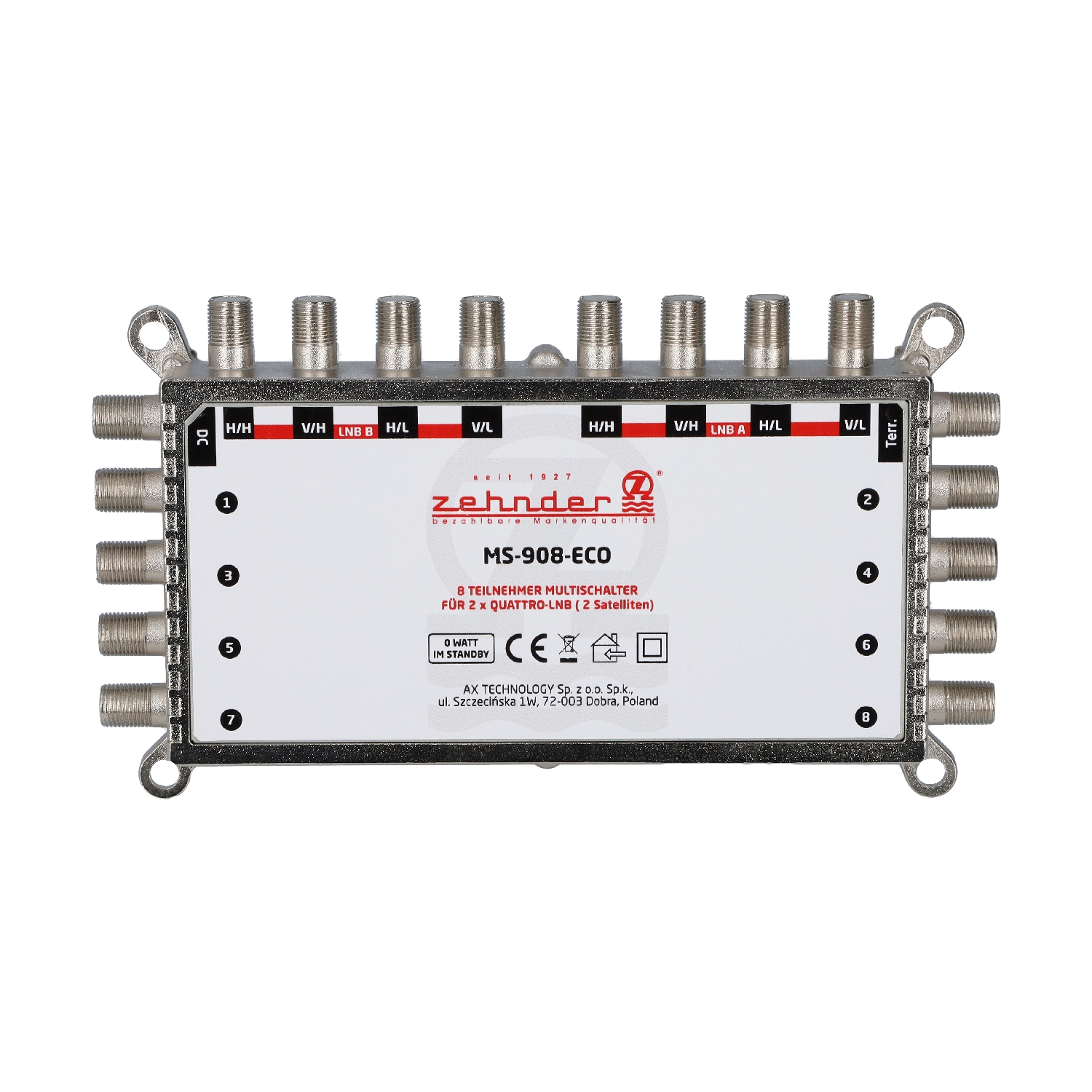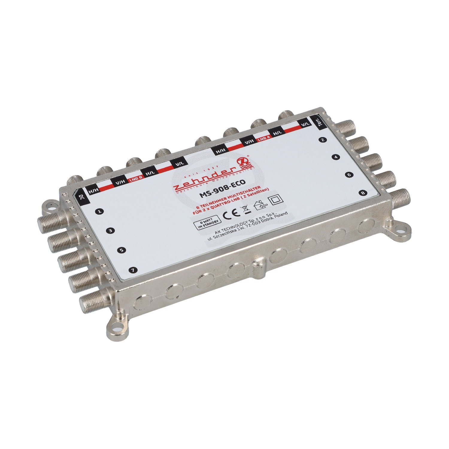 Der ZEHNDER MS-908-ECO ist für die Verteilung von Satellitensignalen und terrestrischen Fernseh- und Radiosignalen in Hausinstallationen konzipiert. Der MS-908-ECO kann die Signale von 2 Satelliten auf 8 Teilnehmer verteilen. Dafür muss er mit zwei Quattro-LNBs betrieben werden. Der Betrieb mit Quattro-Switch-LNBs ist beim Multischalter MS-908-ECO nicht möglich. Dank neuester Technologie und einem sehr energieeffizientem Schaltungskonzept benötigen diese Multischalter kein Netzteil, sondern werden komplett über die angeschlossenen Endgeräte mit Spannung versorgt.