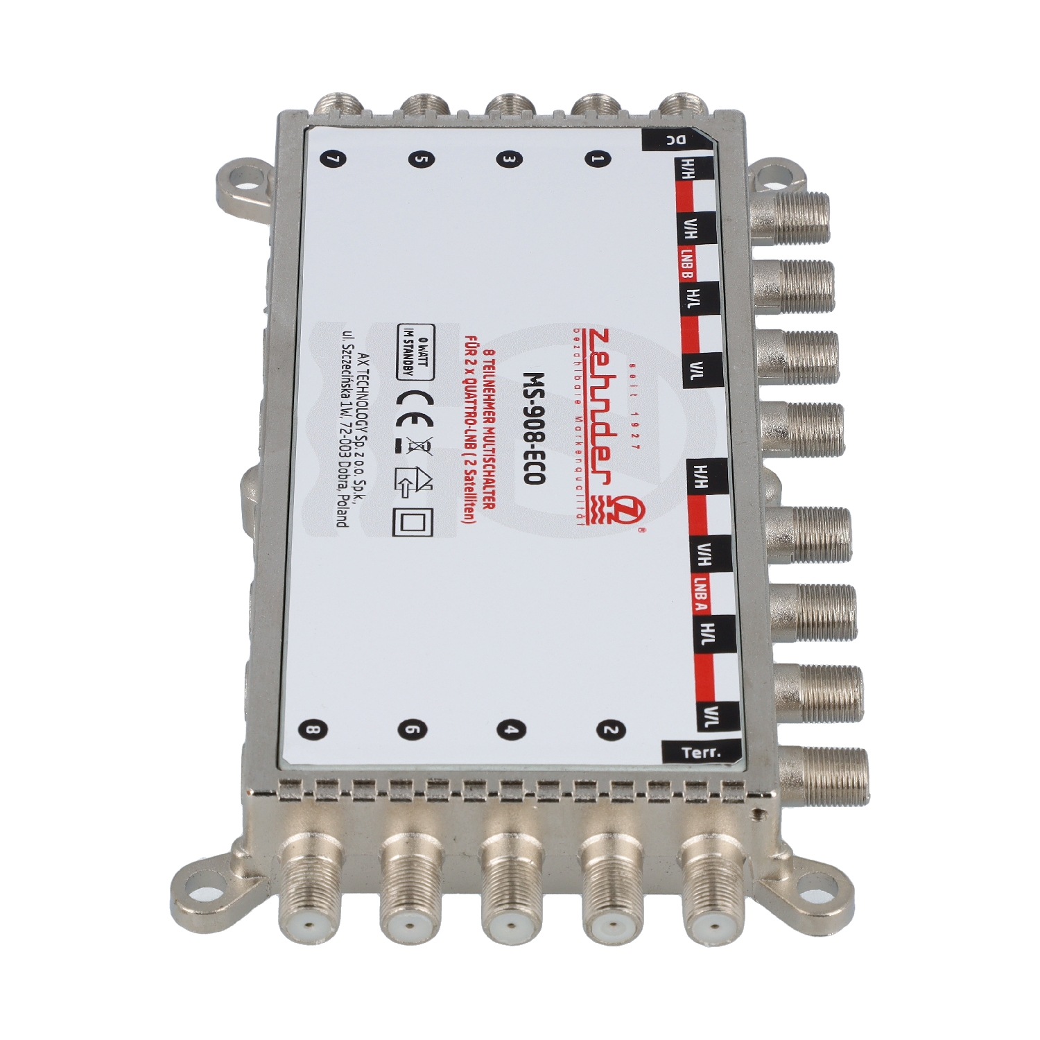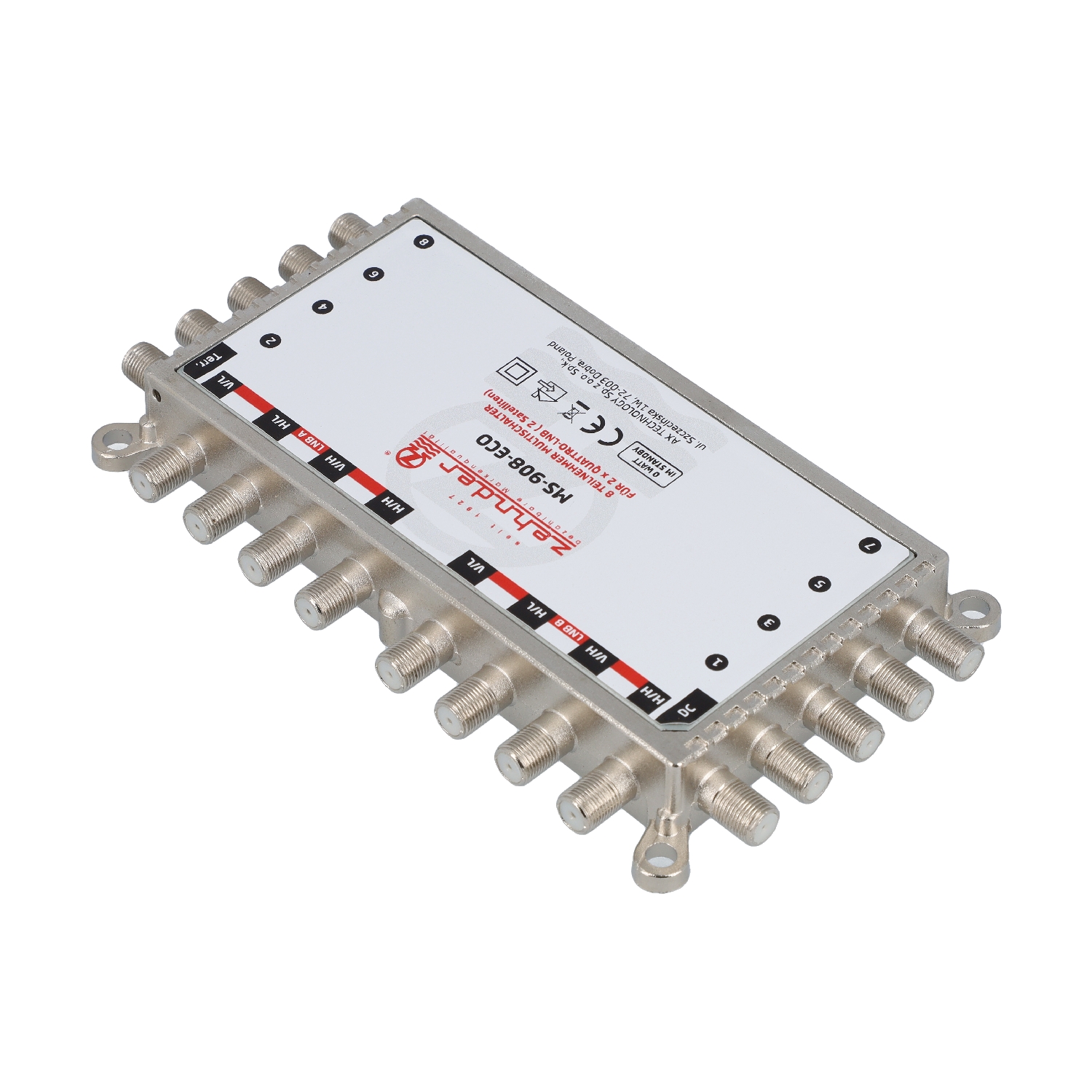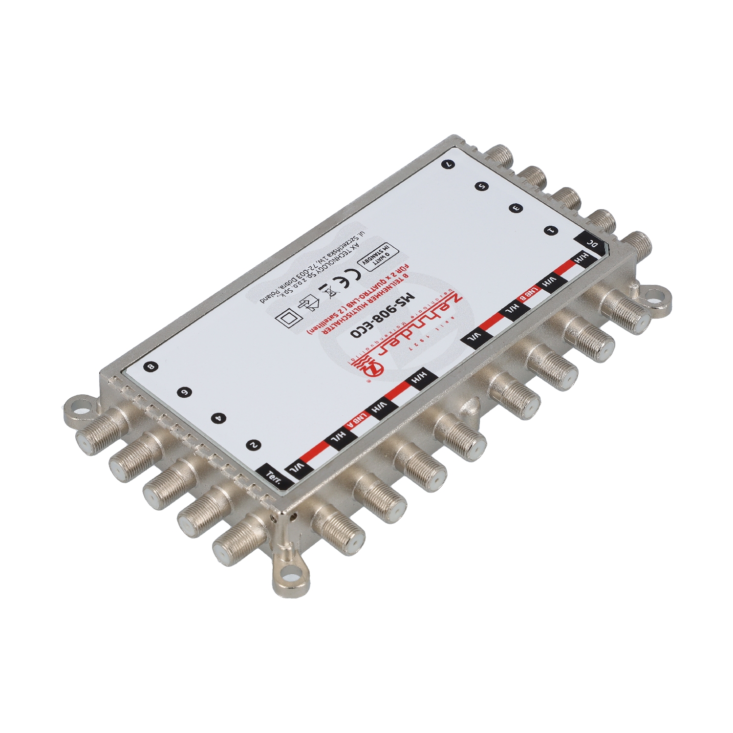 Der ZEHNDER MS-908-ECO ist für die Verteilung von Satellitensignalen und terrestrischen Fernseh- und Radiosignalen in Hausinstallationen konzipiert. Der MS-908-ECO kann die Signale von 2 Satelliten auf 8 Teilnehmer verteilen. Dafür muss er mit zwei Quattro-LNBs betrieben werden. Der Betrieb mit Quattro-Switch-LNBs ist beim Multischalter MS-908-ECO nicht möglich. Dank neuester Technologie und einem sehr energieeffizientem Schaltungskonzept benötigen diese Multischalter kein Netzteil, sondern werden komplett über die angeschlossenen Endgeräte mit Spannung versorgt.