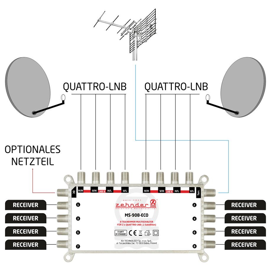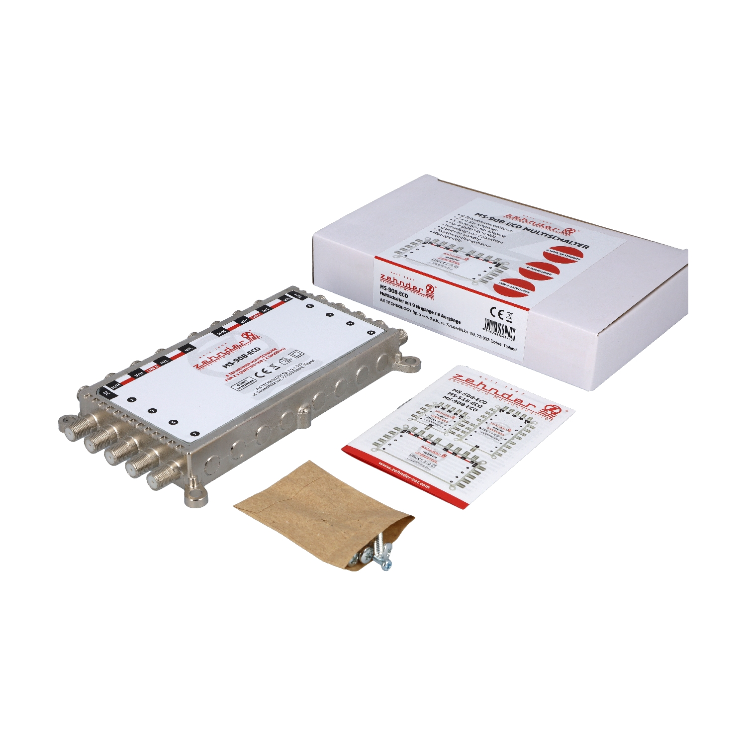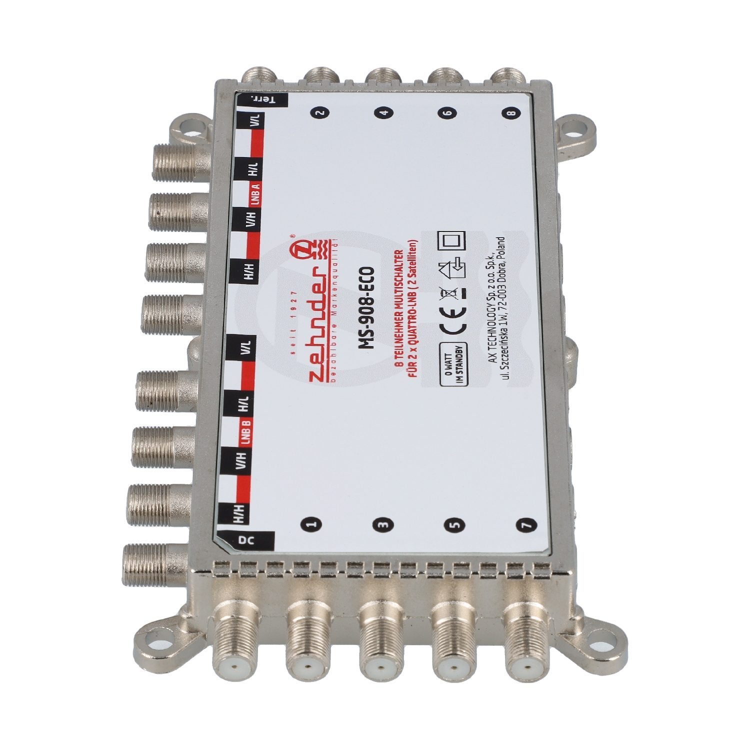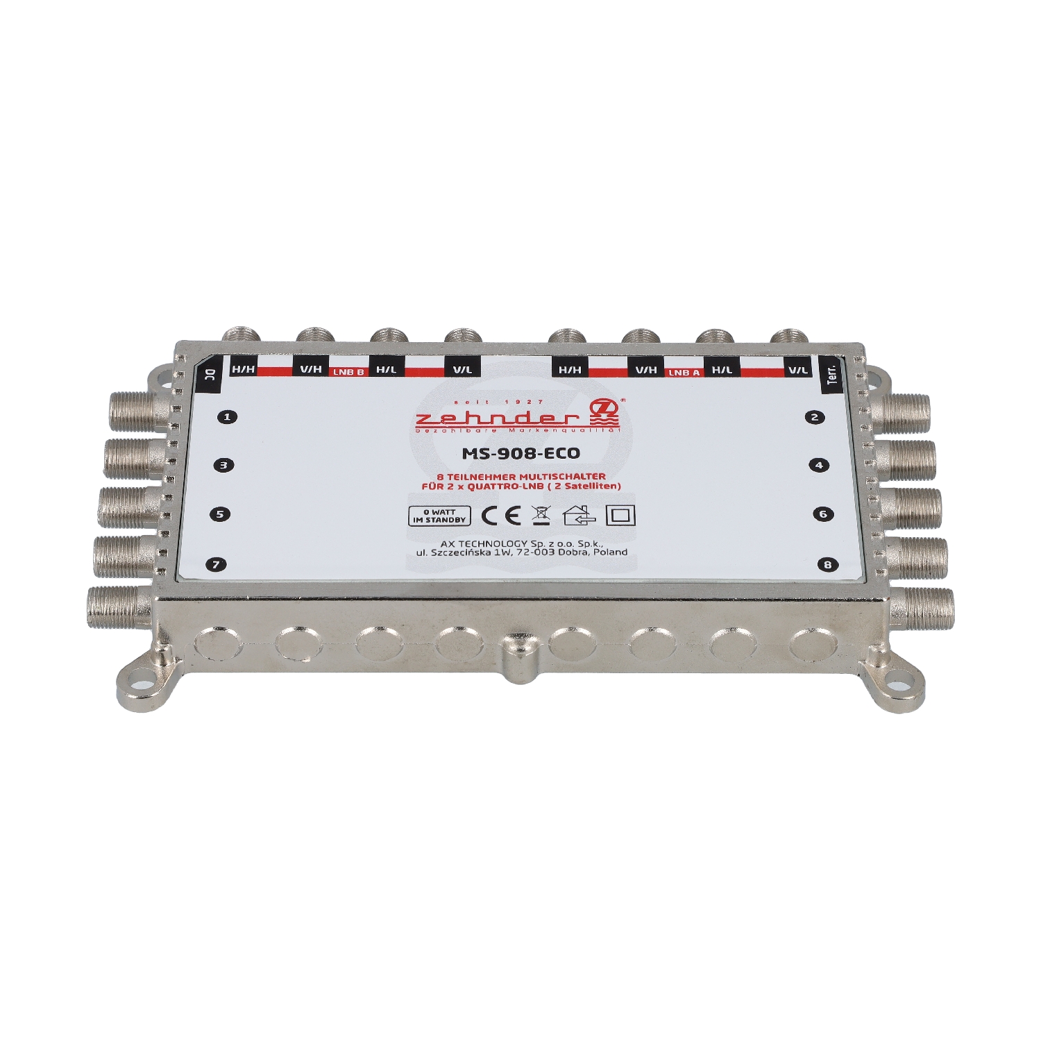 Der ZEHNDER MS-908-ECO ist für die Verteilung von Satellitensignalen und terrestrischen Fernseh- und Radiosignalen in Hausinstallationen konzipiert. Der MS-908-ECO kann die Signale von 2 Satelliten auf 8 Teilnehmer verteilen. Dafür muss er mit zwei Quattro-LNBs betrieben werden. Der Betrieb mit Quattro-Switch-LNBs ist beim Multischalter MS-908-ECO nicht möglich. Dank neuester Technologie und einem sehr energieeffizientem Schaltungskonzept benötigen diese Multischalter kein Netzteil, sondern werden komplett über die angeschlossenen Endgeräte mit Spannung versorgt.